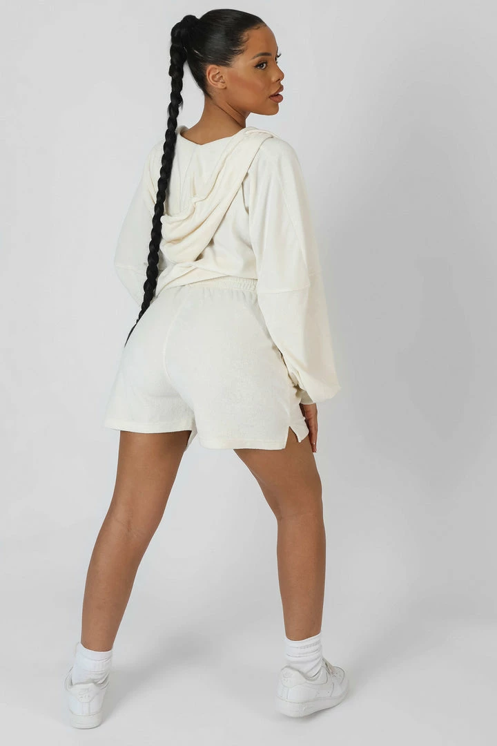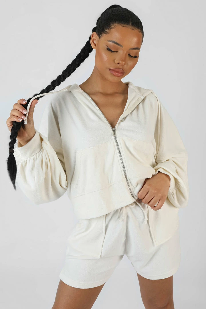 AN OVERSIZED FIT CROPPED ZIP THROUGH HOODIE IN ECRU TOWELLING.