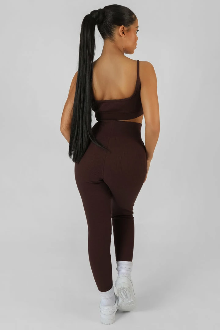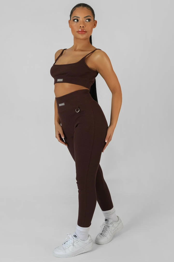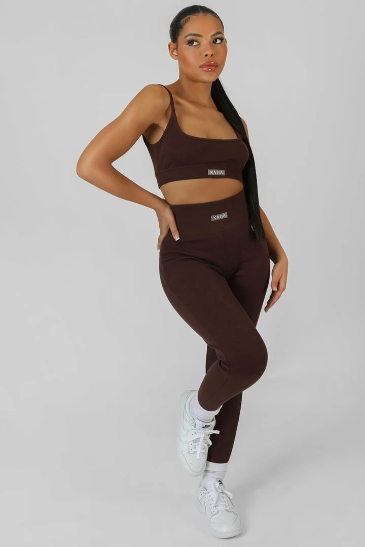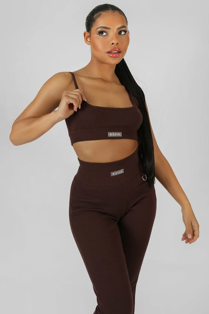 A THIN STRAP SPORTS STYLE BRALET IN CHOCOLATE WITH A SQUARE NECK.